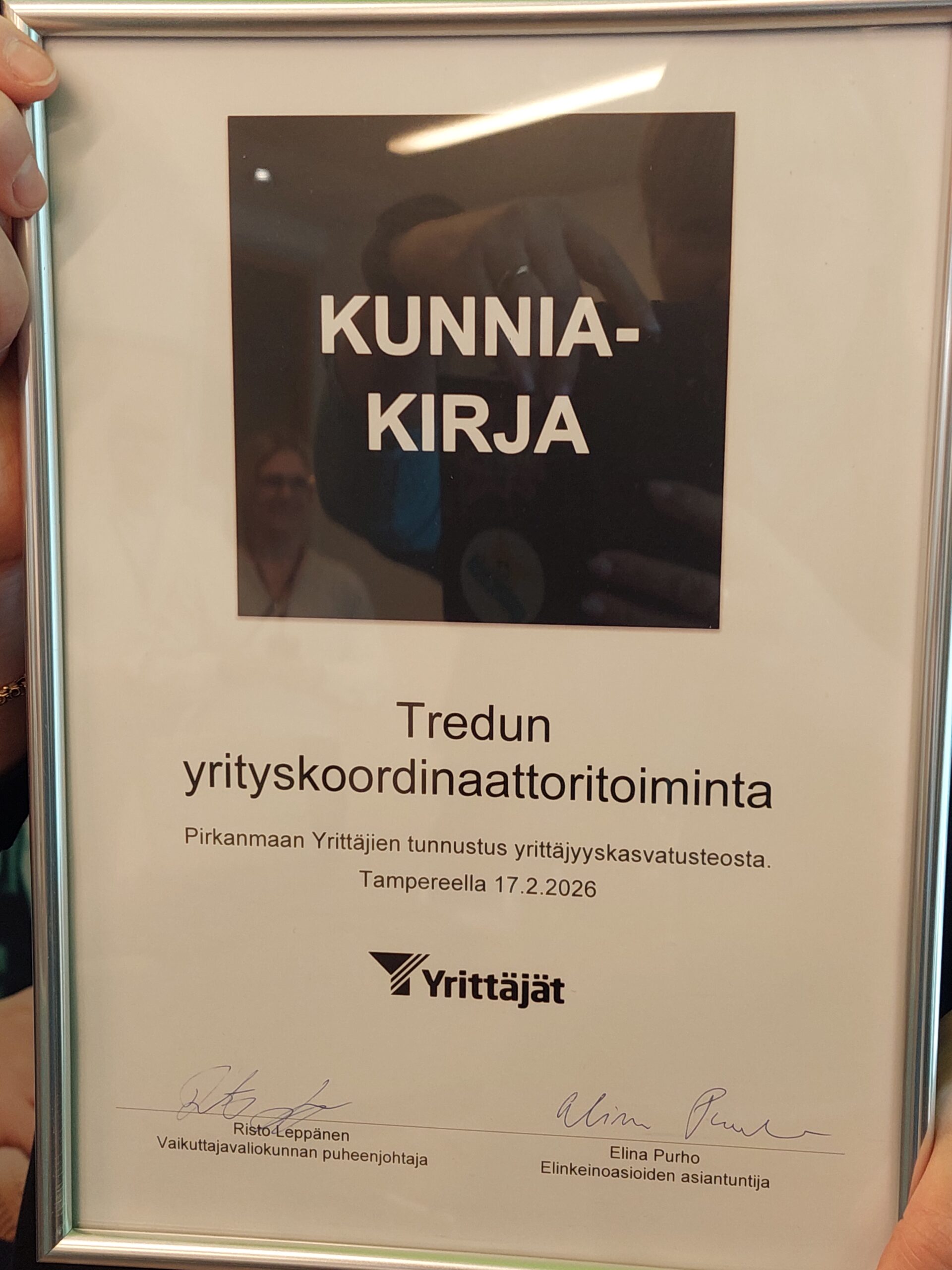 Pirkanmaan Yrittäjät palkitsi 17.2.2026 Tredun yrityskoordinaattoritoiminnan merkittävästä työstä yrittäjyyskasvatuksen parissa. Palkinnon vastaanottivat yrityskoordinaattorit Kaisu Paloheimo, Sari Korju ja Sami Hasila. Palkitsijoina toimivat Elina Purho, elinkeinoasioiden asiantuntija Pirkanmaan Yrittäjistä sekä Risto Leppänen, Pirkanmaan Yrittäjien vaikuttajavaliokunnan puheenjohtaja.